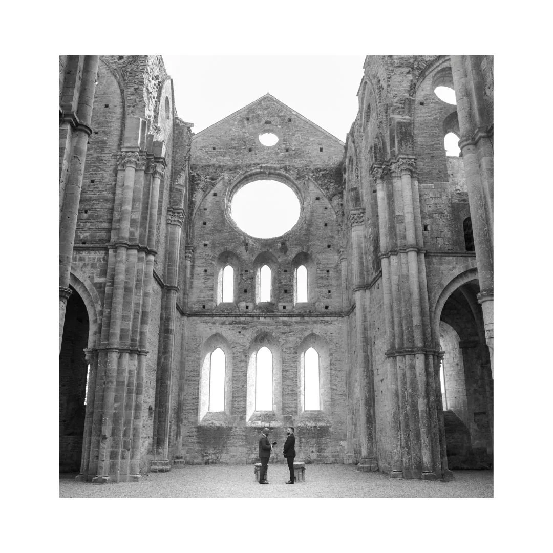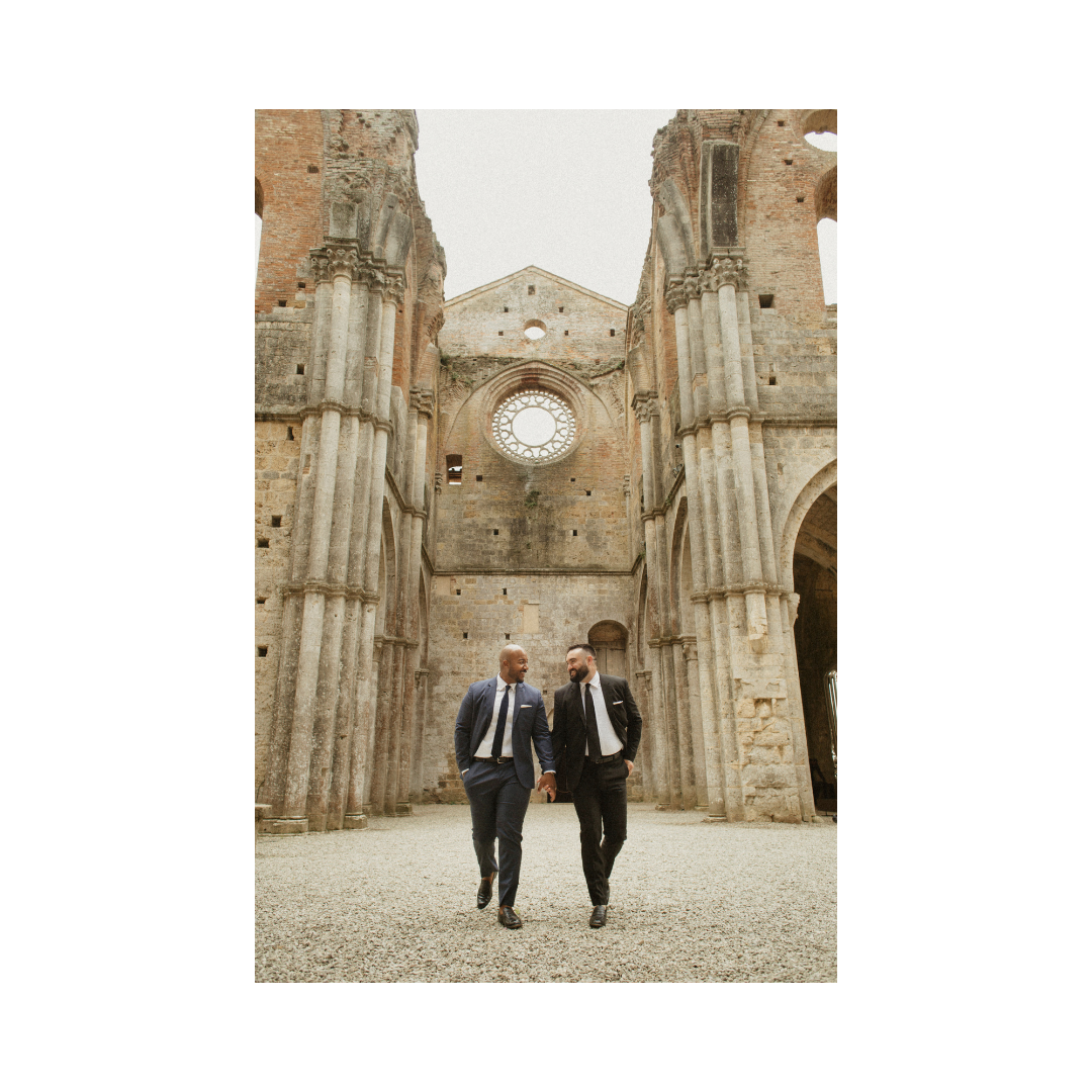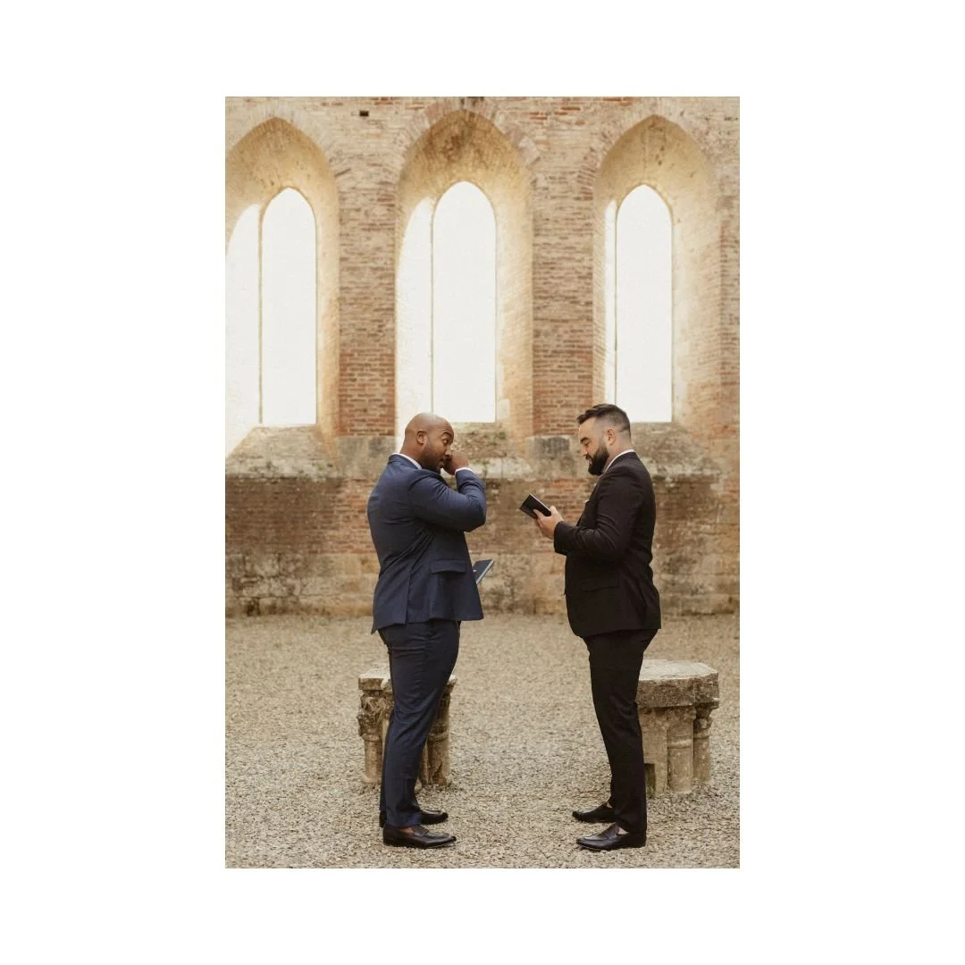 We were married in Tuscany in an extremely intimate ceremony — just the two of us and a photographer. In the ruins of San Galgano Abbey, the remains of Catholic church set among the rolling hills of the Chianti countryside. Once a place of worship, the open-air ruins felt like a poetic nod to both of our religious upbringings — sacred, quiet, and rooted in history, yet open to the sky. The ceremony was simple and deeply personal, unfolding in a setting that felt timeless and grounding. It was a moment that felt entirely our own.